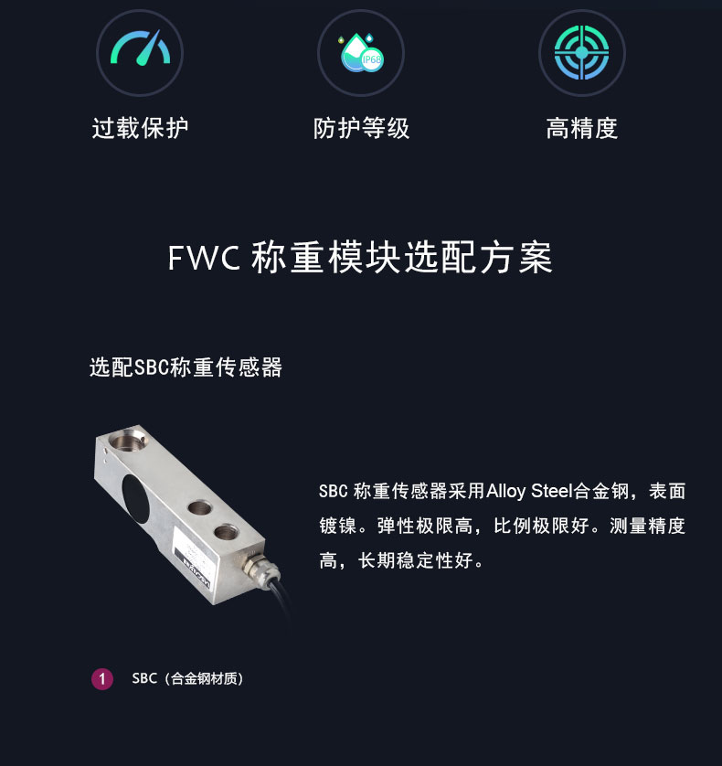 FWC静载称重模块采用了SBC/SQB悬臂梁式传感器,0.5t到5t可选,其特点是结构紧凑,不需安装其他配件,自稳定的传感器承压头使计量精确,重复性好;快速简便的安装,节约安装和停机维修时间。静载称重模块可以方便地安装在各种形状的容器上,并可在此容器中方便地进行装料、配料或搅拌。